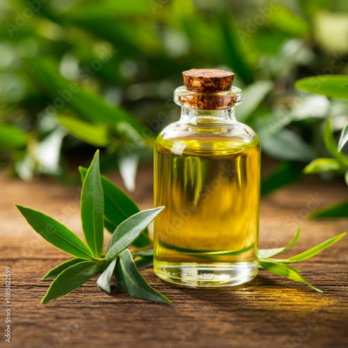 Tea tree oil next to fresh green tea tree leaves
