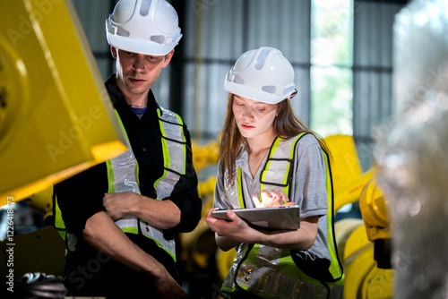 team engineers inspecting on machine with smart tablet. Worker works at heavy machine robot arm. The welding machine with a remote system in an industrial factory. Artificial intelligence concept.