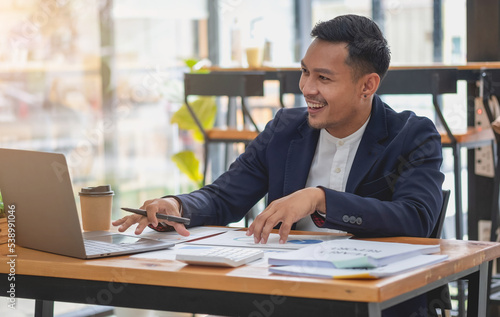 Team of business use calculators and graph analysis computer laptop tablets to plan marketing strategies and make profitable investments for the company.