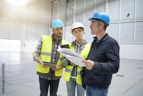 Team of construction workers talking in empty warehouse