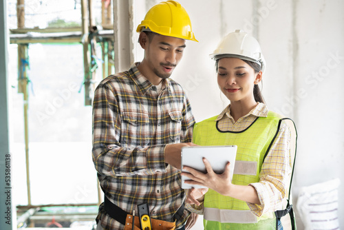 Team of worker inspector or engineer is checking audit and discussing plan to renovation the building or house by touchpad as Inspection and Engineering concept