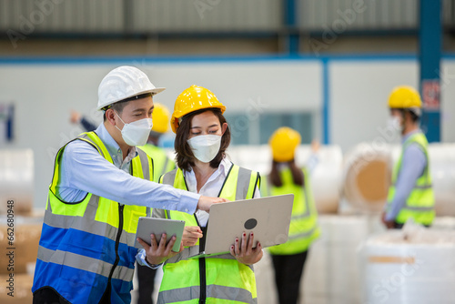 Teamwork engineer in uniform wear protection mask brainstorming workshop industrial factory using laptop and tablet.
