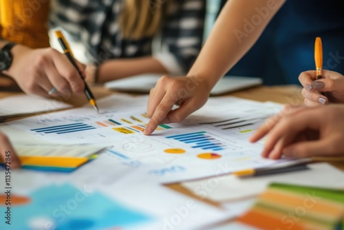 teamwork meeting discussing a new project and hand pointing graph on paperwork