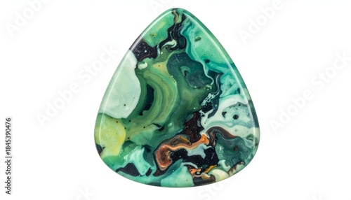Teardrop-shaped stone with swirled green, black, orange, and white patterns, on white