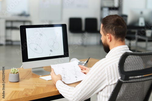 Technician making digital engineering drawing on computer at desk in office