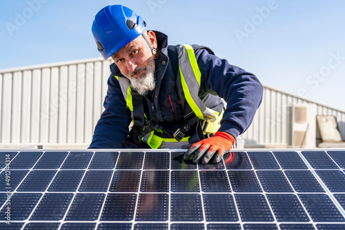 Technician with helmet by solar panel on sunny day