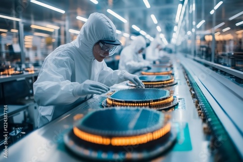 microchip, semiconductor, manufacturing, factory, production, technology, electronic, industry, assembly line, men at work, technician, engineer, suit, innovation, science, high technology, futuristic, industrial, circuit, silicon, wafer, component, hardware, assembly, quality control, precision, automated, modern, development, research, engineering, central processing unit, integrated circuit, microelectronics, microprocessor, chips, computer, equipment, process
