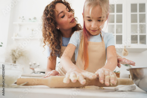 Teen girl helping her mom to cook dough in their kitchen at home