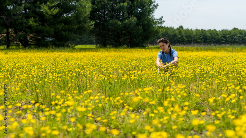 Teen girl sitting in large field with yellow flowers and trees in the background