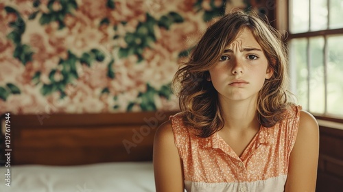 teenage girl, girl, teenage, portrait, worried, sad, thoughtful, emotional, pensive, concerned, retro, vintage, room, interior, floral, wallpaper, flower, pattern, background, home, house, bedchamber, bed, furniture, style, fashion, expression, face, emotion, mood, feeling, youth, adolescence, missy