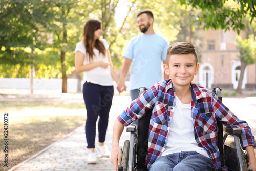 Teenage boy in wheelchair with his family walking outdoors