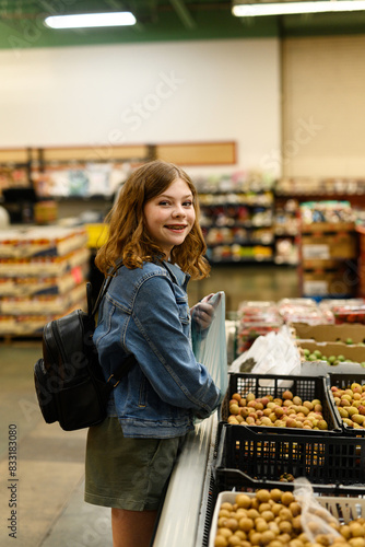 teenage, girl, grocery, shopping, supermarket, produce, lychee, young, casual attire, smiling, fruit, healthy, organic, fresh, selection, market, indoor, red hair, browsing, choosing, food, aisle, consumer, lifestyle, retail, healthy eating, nourishment, public, agriculture, supply, commerce, client, natural, shelf, food market, buyer, purchase, fresh produce, delicatessen, health, tropical fruit, braces, oregon, us, tween, one person, female, white