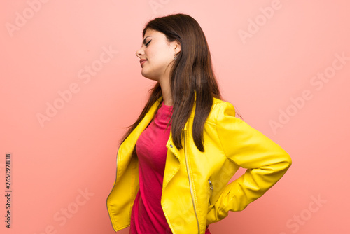 Teenager girl over pink wall suffering from backache for having made an effort