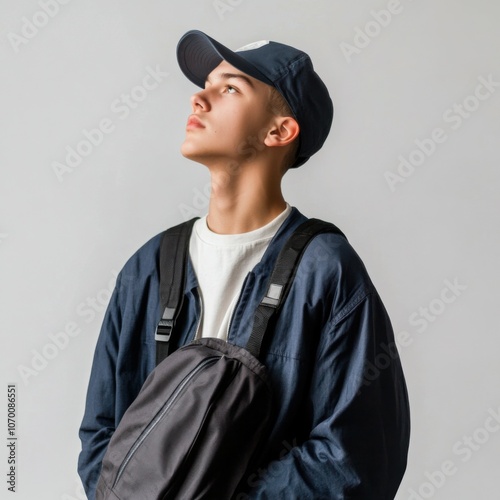 Teenager in a baseball cap with a messenger bag, isolated on a light grey background portraying a sense of modernity and spontaneity in urban adventures