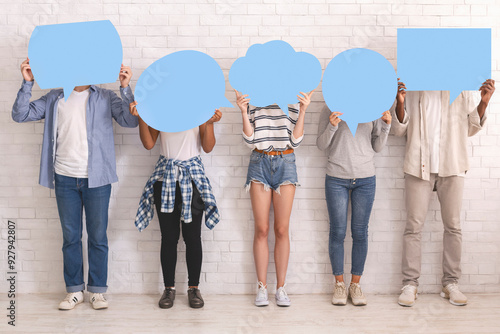 Teenagers in casual clothes standing next to wall and hiding behind colorful communication bubbles