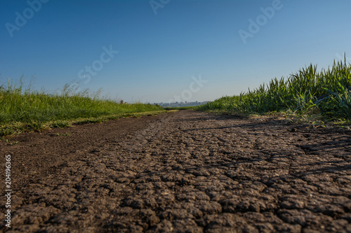 field, agriculture, landscape, sky, nature, farm, rural, land, dirt, road, blue, dirtied, spring, summer, plowed, green, grass, countryside, country, horizon, cloud, ploughed, ground, earth, farming