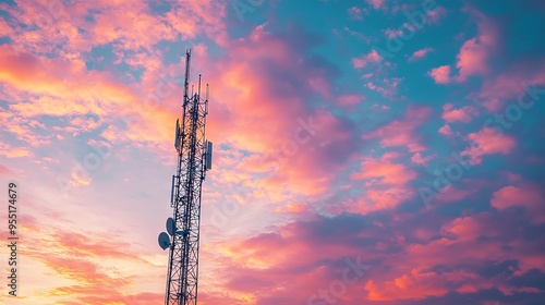 Telecommunications Tower Against Sunset Sky with Antenna. AI generated illustration