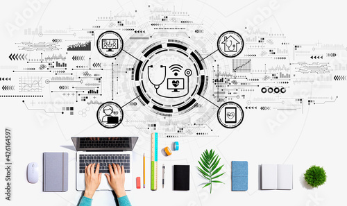 online, health, virtual, health care, computer, doctor, medicine, medicals, consultation, flu, virus, flu, pandemic, epidemic, disease, sick, laptop, notebook, tech, hand, business, technology, office, desk, digital, concept, minimal, up high, flat, lay, overhead, view, top, background, woman, white
