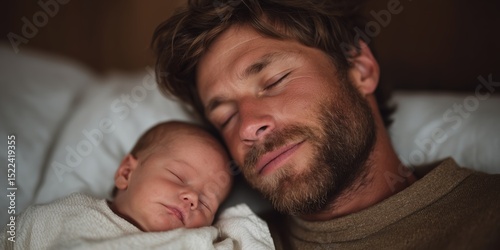 Tender moment: father bonding with newborn baby son during restful nap