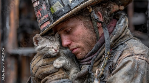 Tender moment of a firefighter comforting a rescued kitten, burned building behind