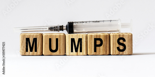 Text MUMPS made from wooden cubes. White background