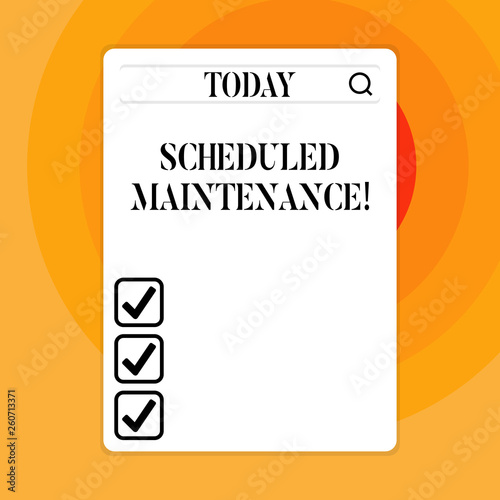 Text sign showing Scheduled Maintenance. Business photo showcasing predetermined maintenance carried out at regular time Search Bar with Magnifying Glass Icon photo on Blank Vertical White Screen