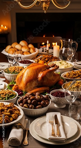 thanksgiving, dinner, table, turkey, food, meal, feast, stuffing, gravy, vegetable, bread, holiday, celebration, home, family, friends, autumn, fall, dinnerware, plate, utensil, candlelight, warm, gold, roasted, delicious, abundant, interior, home cooking, traditional, festive, epicure, food photography, receipe, holiday spirit, autumn, seasonal