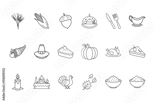 thanksgiving, feast, cornucopia, drawing, event, seasonal, pilgrim, cutlery, acorn, set, candle, collection, gravy, corn, pumpkin, wheat, holiday, pie, outline, turkey, harvest, celebration, doodle, leaf, icon, fall, minimal, simple, traditional, cake, autumn