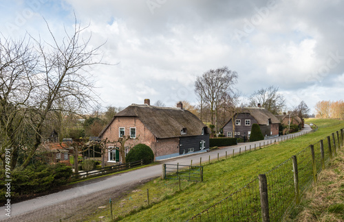 Thatched farm houses along a Dutch dike
