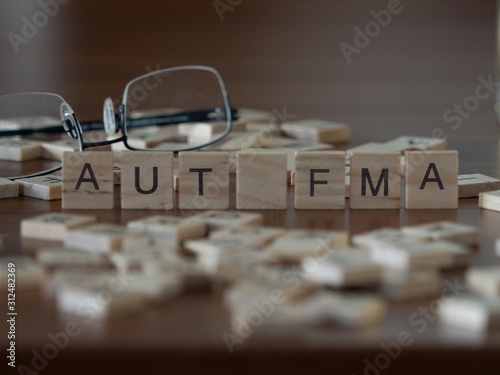 the acronym aut fma for Financial Market Authority (FMA) concept represented by wooden letter tiles
