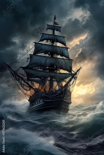 ship, vessel, watercraft, seafaring, maritime, ocean, high seas, horizon, white horse, swell, turbulent, stormy, rainstorm, cloudburst, precipitation, overcast, gloomy, dreary, ominous, foreboding, dramatic