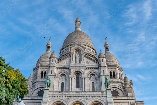The ancient Basilica of the Sacred Heart in Montmartre, Paris, France, with birds flying near the domes