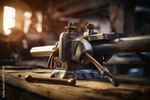 The Art of Craftsmanship: A Swaging Tool Highlighted by the Soft Overhead Lights in a Rustic Workshop