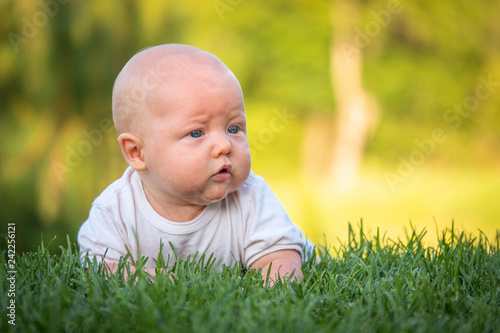 The baby lies or crawls on a green lawn at sunset and looks surprised. Emotions baby. Vacation with children. Childcare. Goods for kids. Sun protection. Child development.