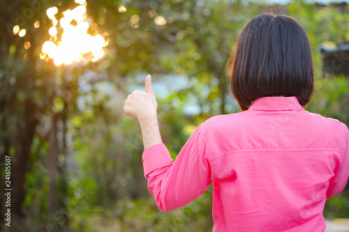 The back of Asian short haired girl holding showing thumbs-up over nature background. Concept Congratulations and encouraging.