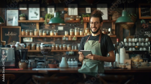 cafes, hot drink, technology, barista, man, smiling, client, men at work, relaxed, professional, happy, beverage, wood, workplace, tablet, goggles, bar, beard, service, shop, latte, owner, indoor, urban, apron, entrepreneur, digital, drink, lifestyle, modern, interior, stylish, counter, small, hipster, brewery, server, workwear, countertop