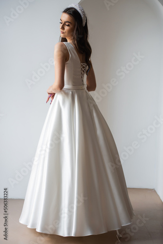 The beautiful woman posing in a wedding dress