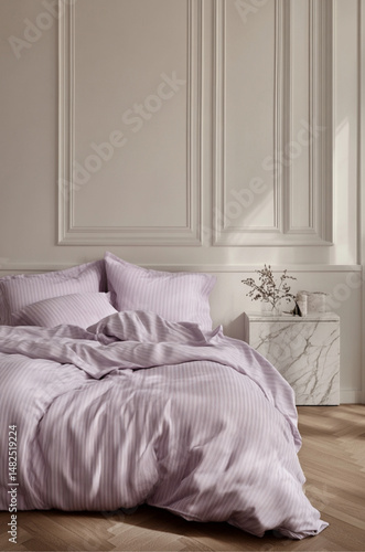 bed, purple, plant, room, painting, wall, grey, striped, line, table, bedchamber, hotel, interior, furniture, home, pillow, luxury, design, lamp, pillow, house, comfortable, sofa, indoor, sleep, apartment, light, decor, architecture, decoration, bedding, suite