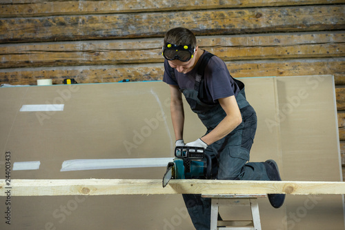 The builder saws wood electric saw. He likes this job.