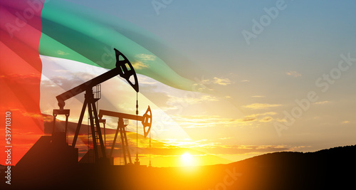 The change in oil prices caused by the war. Oil prices are rising because of the global crisis. Oil drilling derricks at desert oilfield with UAE flag. Crude oil production from the ground.