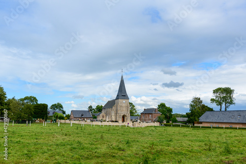 The church of the traditional French village of Saint Sylvain in the middle of the fields in Europe, France, Normandy, towards Veules les Roses, in summer, on a sunny day.