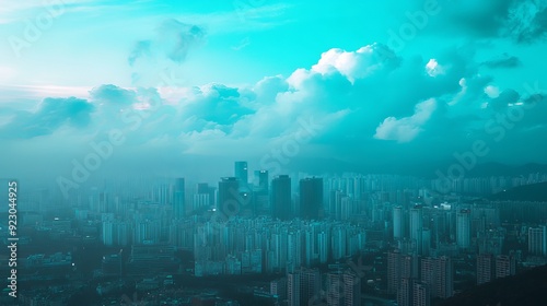 The city view of Seoul under a sky-blue backdrop offers a stunning and vibrant panorama.