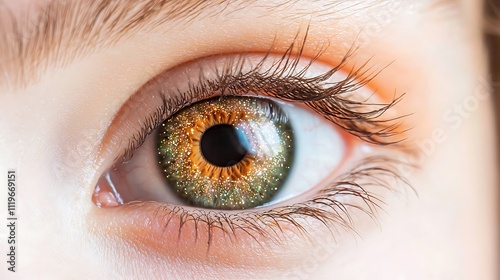 The close up image showcases a mesmerizing eye glistening with shimmering glitter, creating a captivating and enchanting effect.