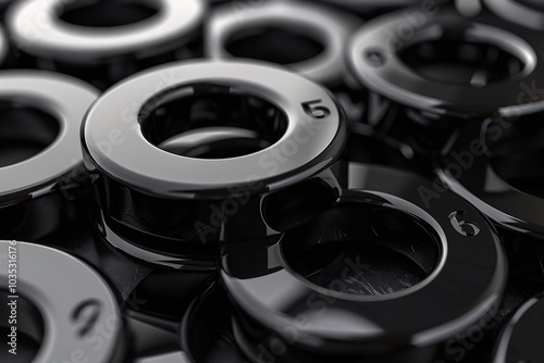 The collection of black rings, each marked with a unique number, lies scattered on a dark textured surface, creating a striking visual display of depth and contrast