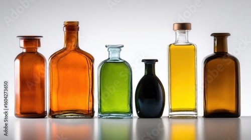 bottle, glasses, amber, green, black, yellow, vintage, container, liquid, still life, photo, kitchen, tabletop, decorative, artistry, minimalism, design, shadow, reflections, textured, empty, modern, environmentally friendly, cardboard box, beverage, storage, artwork, stylish, elegant, colours, isolate, craft, light, composition, display, aesthetic, natural, home, panoramic