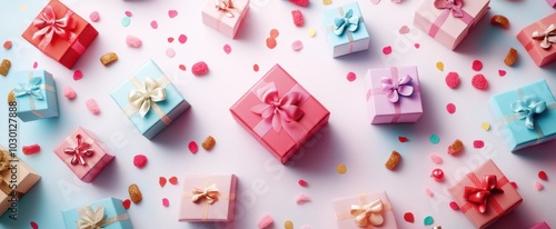 gift, present, celebration, colours, bow, party, decoration, festive, background, surprise, wrapped, joyful, event, holiday, pink, blue, confetti, cheerful, design, luxury, accessory, occasion, treat, arrangement, creativity, wrapping
