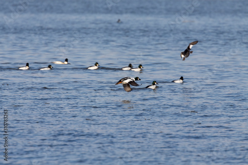 The common goldeneye (Bucephala clangula). large flocks of these ducks pull during early winter from north to south each year