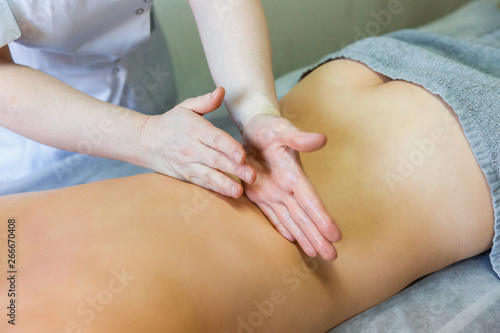 The concept of back massage treatment. Female masseur doing massage to the girl.