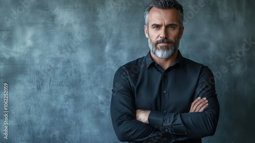 man, portrait, serious, beard, business, adult, stylish, grey, confident, expression, lifestyle, casual attire, modern, photo, assertive, male, photogenic, background, elegant, attitude, emotion, posing, looking, shirt, mature, realistic, studio, model, character