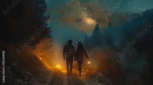 couple, walking, hand, star, lantern, lighting, way, dark, forest, surrounding, campground, softly, glowing, distance, quiet, beauty, romance, night, cinematic, framing, natural, hd, quality, peaceful, serene, intimate, nature, connection, gloaming, glow, starlight, togetherness, love, calm